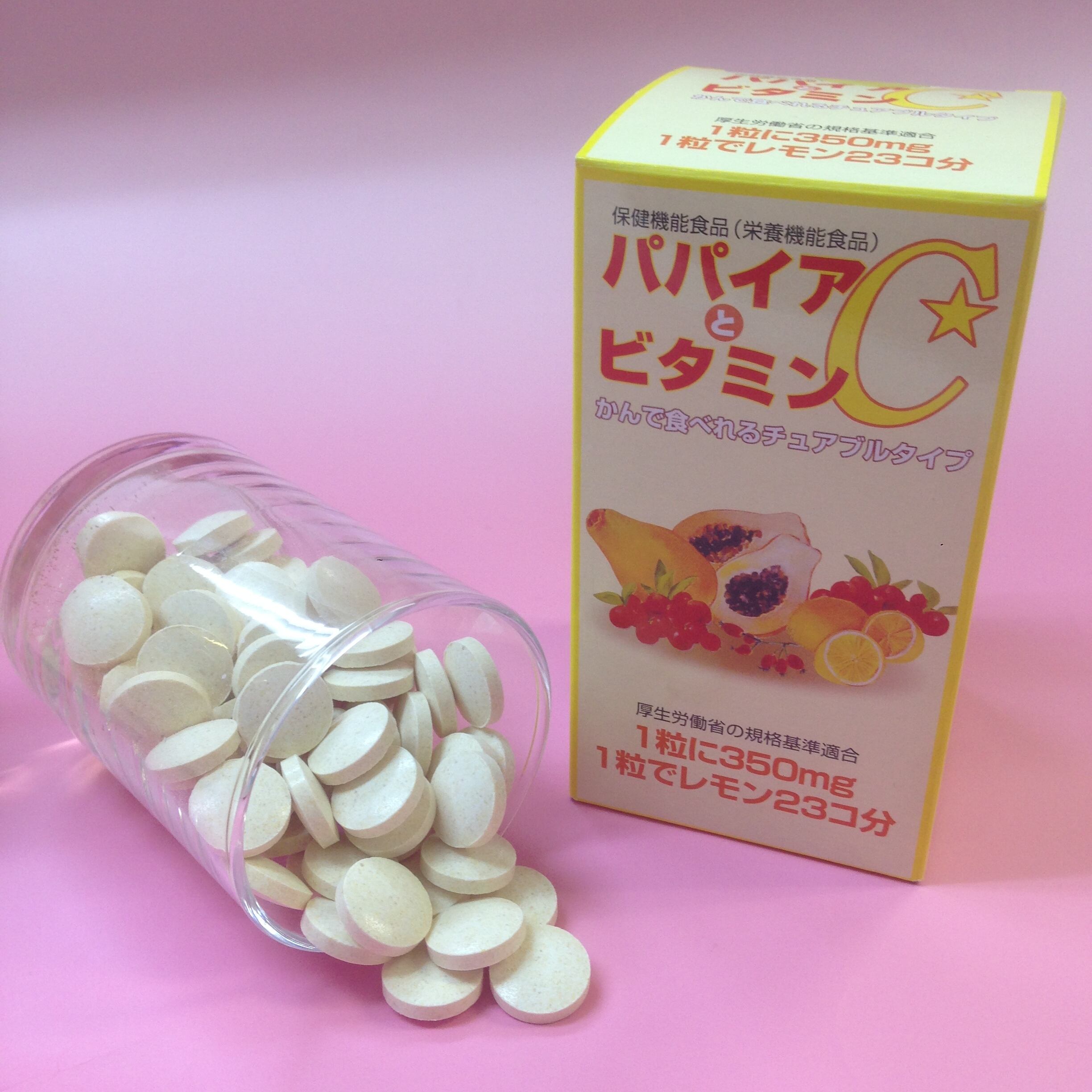 ビタミンC・パパイアパウダー・還元麦芽糖・はちみつ粉・キビ砂糖・パンプキン末・濃縮アセロラ末・ローズピップ末・ショ糖エステル・甘味料(アセスルファムK)